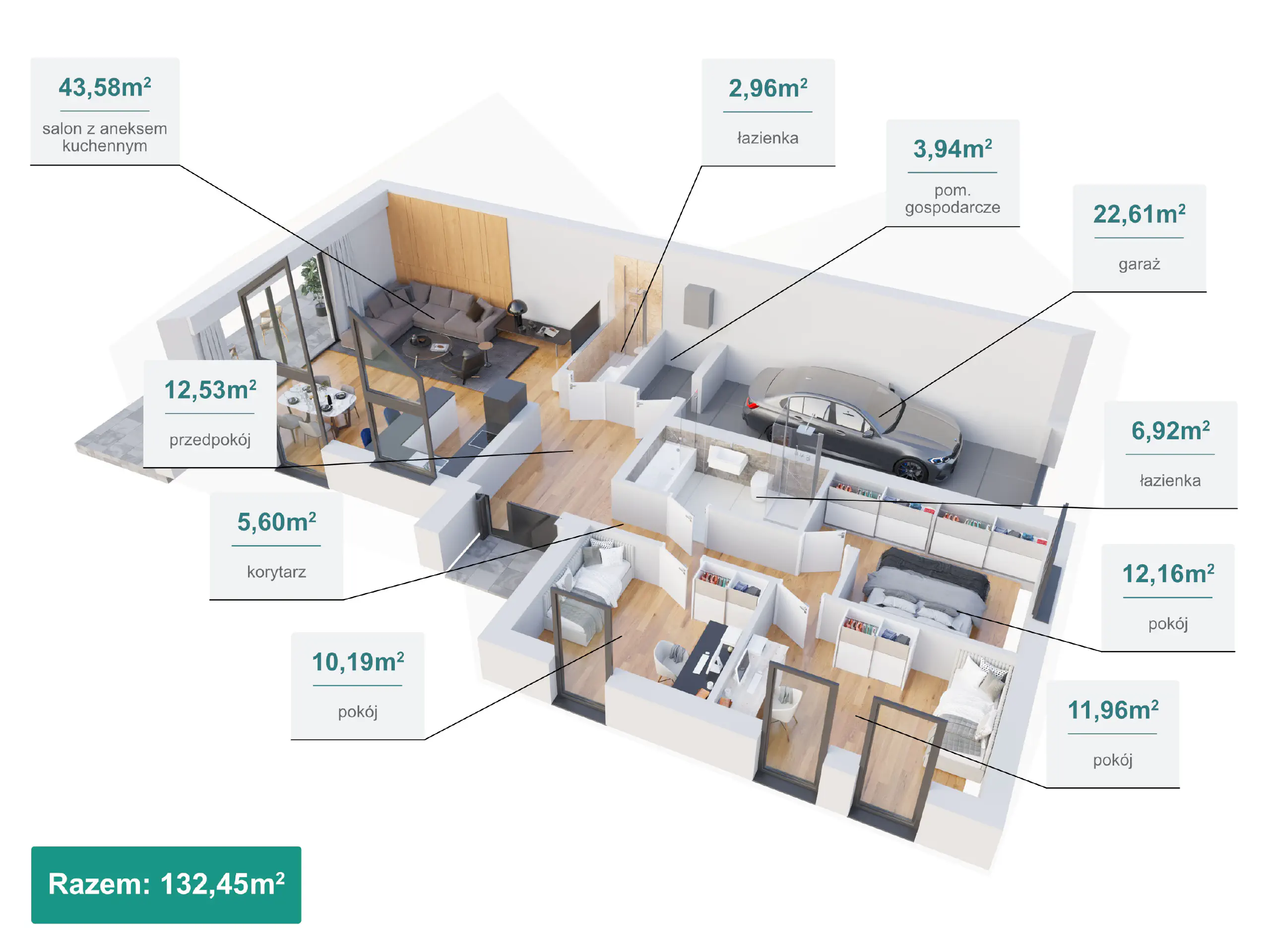 - 4 pokoje, aneks kuchenny z jadalnią, 2 łazienki, pomieszczenie gospodarcze;