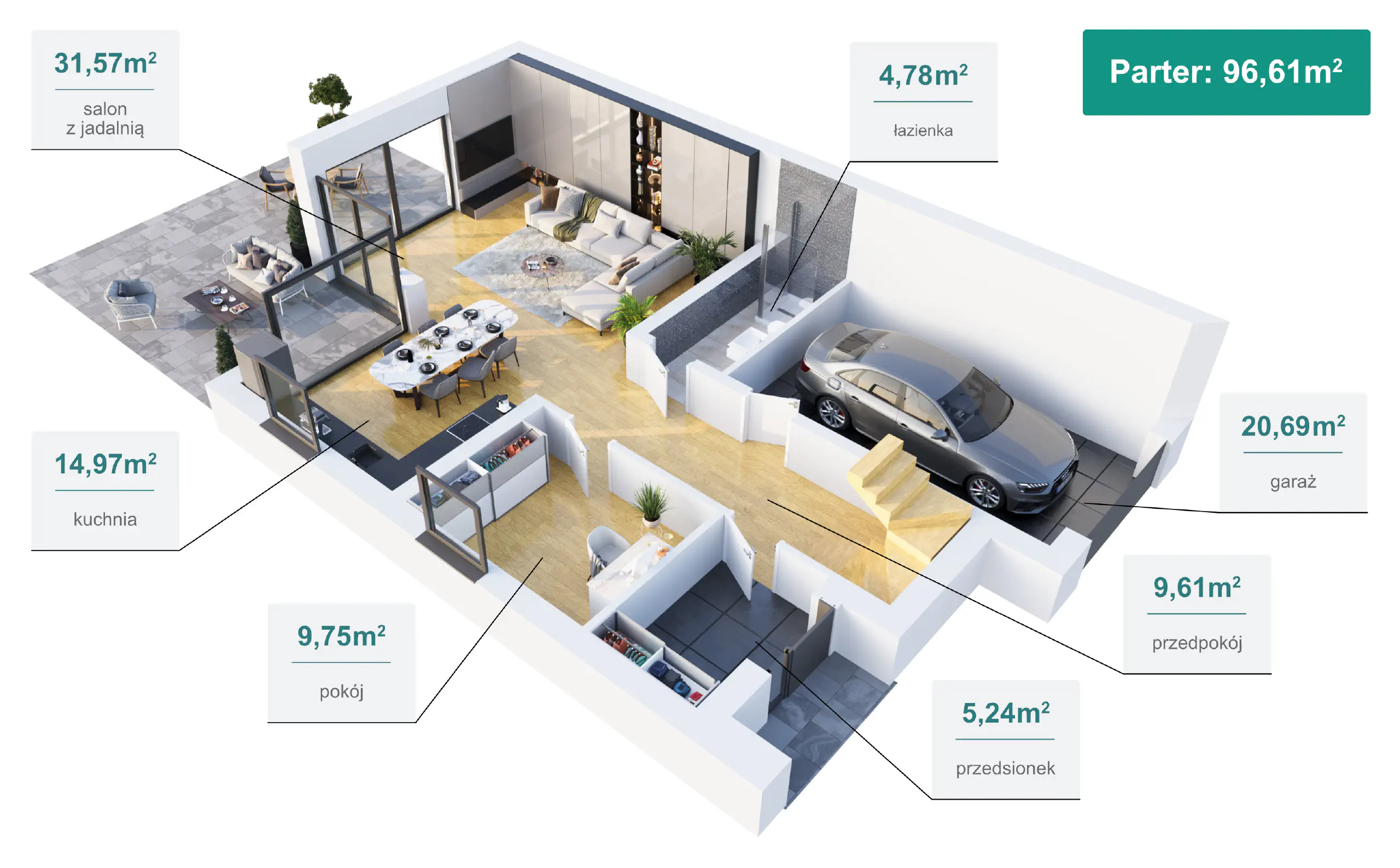 - jednostanowiskowy garaż o powierzchni 20,69 m², dodatkowe miejsce postojowe;